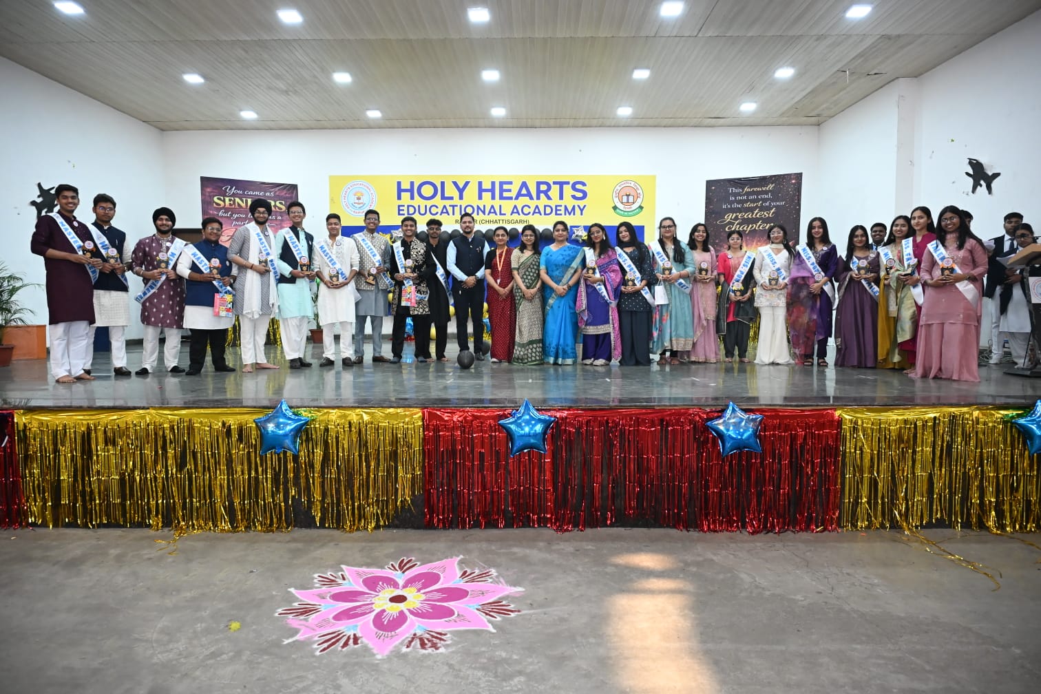 Holy Hearts School hosted a vibrant farewell ceremony where Class 11 students bid an emotional goodbye to the Class 12 batch. The seniors looked elegant in traditional attire, making the event memorable and graceful.The prestigious title of Miss & Mr. Holy Hearts was awarded to Samriddhi Keswani and Chitresh Chandel.Several other titles were also presented, including Appreciation, Punctual, Smile, Popular, Perfectionist, Talented, Athlete, Cabinet, and Farewell, celebrating the unique qualities of the students.The program concluded with heartfelt memories, gratitude, and best wishes for the bright future of the outgoing batch.